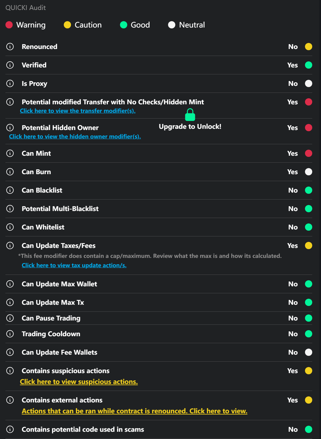 不過呢,用 Quick Intel 檢測這個用 Thirdweb 創建的合約,還是亮起不少黃燈和紅燈:
